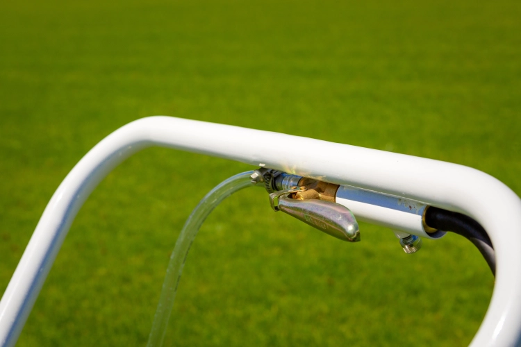 This pitch plotter operates on a spraying system. Easily activate the spray with the handle on the handlebar, which will trigger the spray on the side of the tracer. It can only be used on natural turf. It is possible to transport up to 10L of paint.