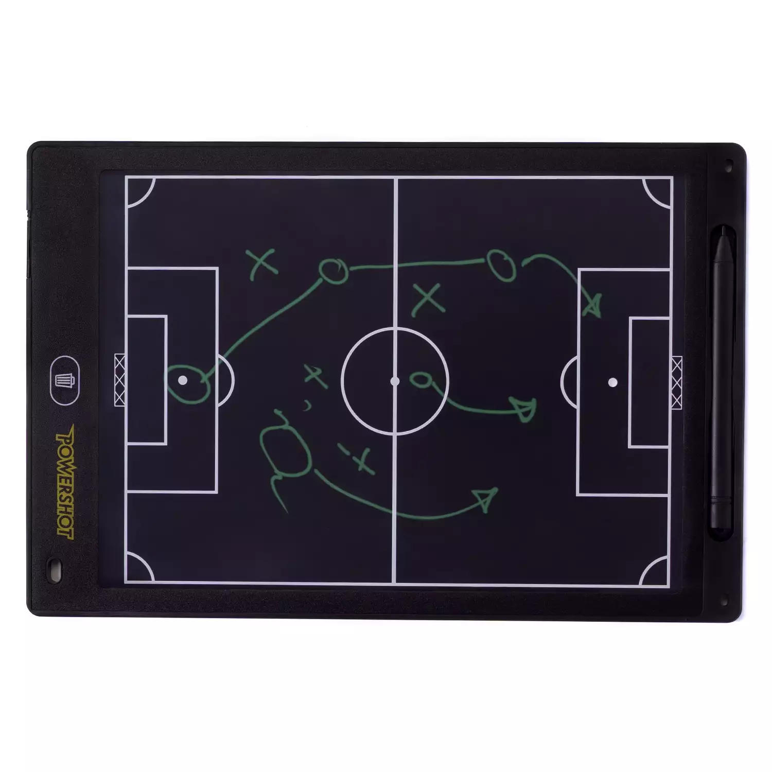 This ink-free tactical tablet will allow you to explain your tactics at any time. The stylus is secured to the tablet. Ability to reuse endlessly! To remove your tactic, simply press the trash button.