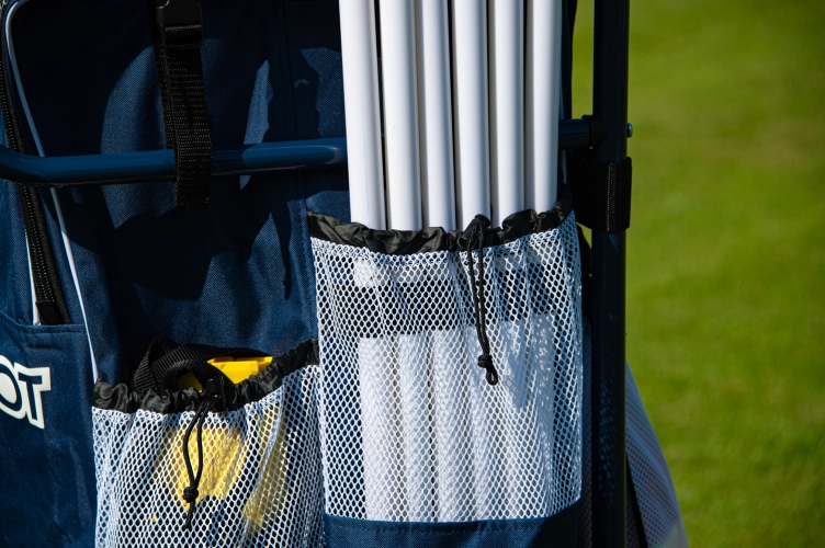The cart also includes a carrying bag for bibs that can be unhooked and put straight into the washing machine. It also features Velcro hooks for attaching hoops and other training equipment.