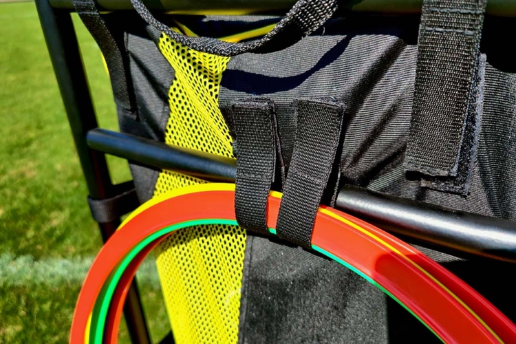 The cart also includes a carrying bag for bibs that can be unhooked and put straight into the washing machine. It also features Velcro hooks for attaching hoops and other training equipment.